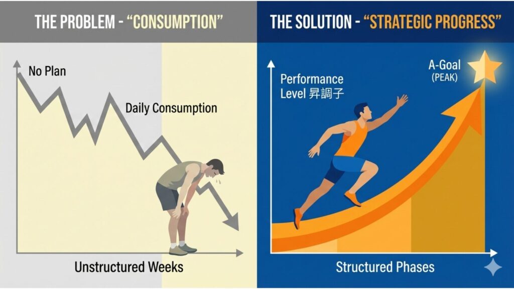 - ピークアウトの回避: 最高の状態(ピーク)が崩れるリスクを管理し、最も重要な日に最高のコンディションを持っていく。
