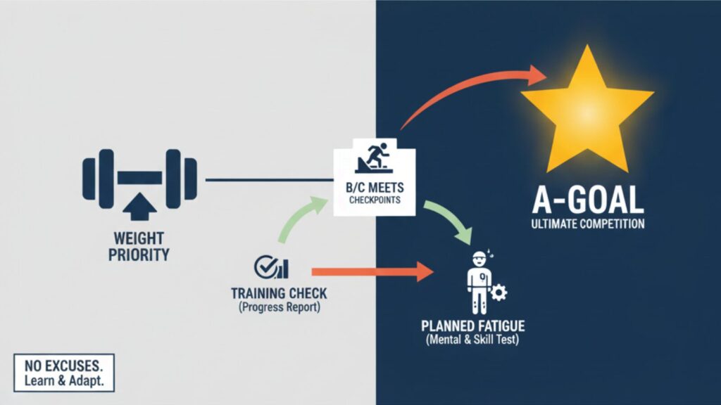 しかし、A目標に向けてコンディションを最適化するため、その他の試合を計画の進捗を確認する通過点とし、ウェイトトレーニングの成果を積み上げる期間を確保することが必要です。