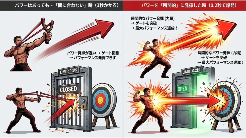 時間をかければ挙がる重量を競うパワーリフティングなら正解ですが、刻一刻と状況が変わる多くのスポーツにおいては、ゆっくり動いている暇はありません。